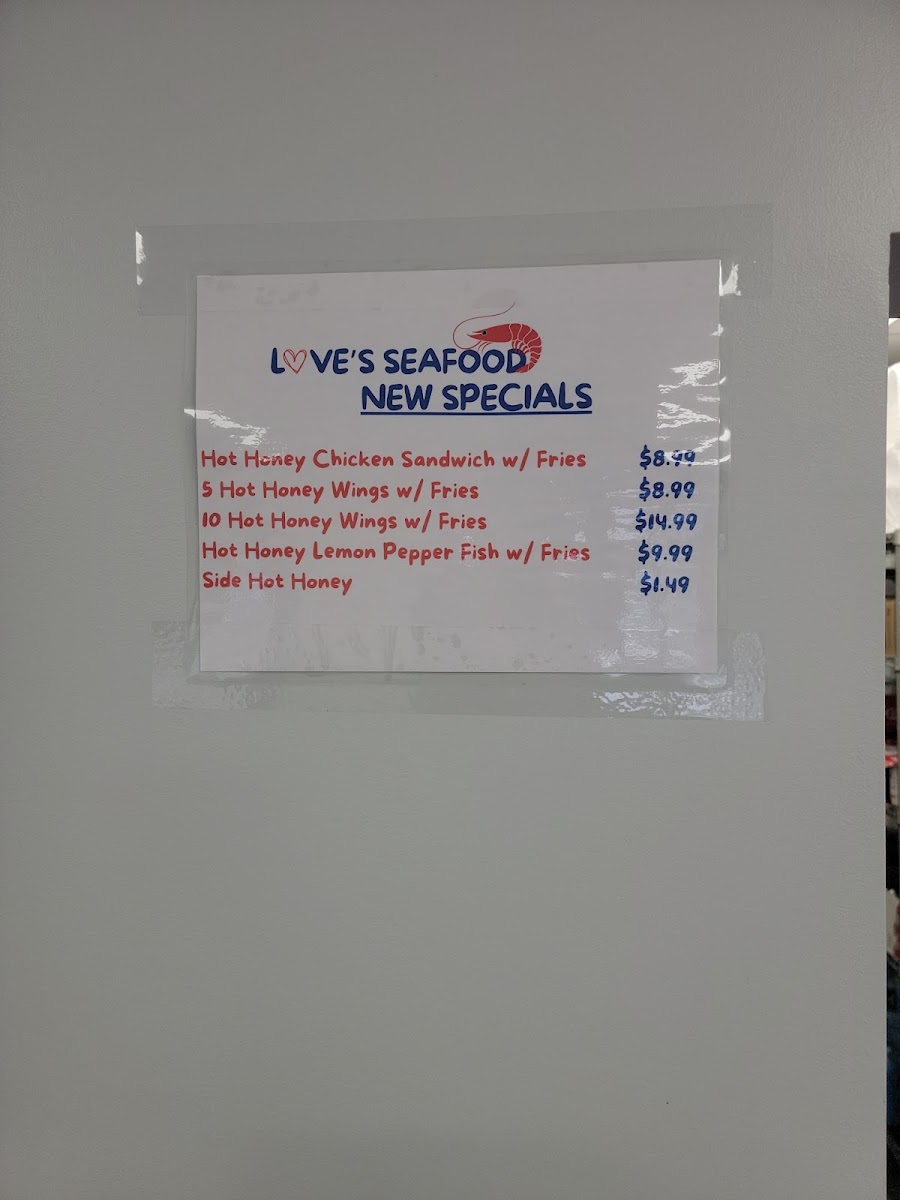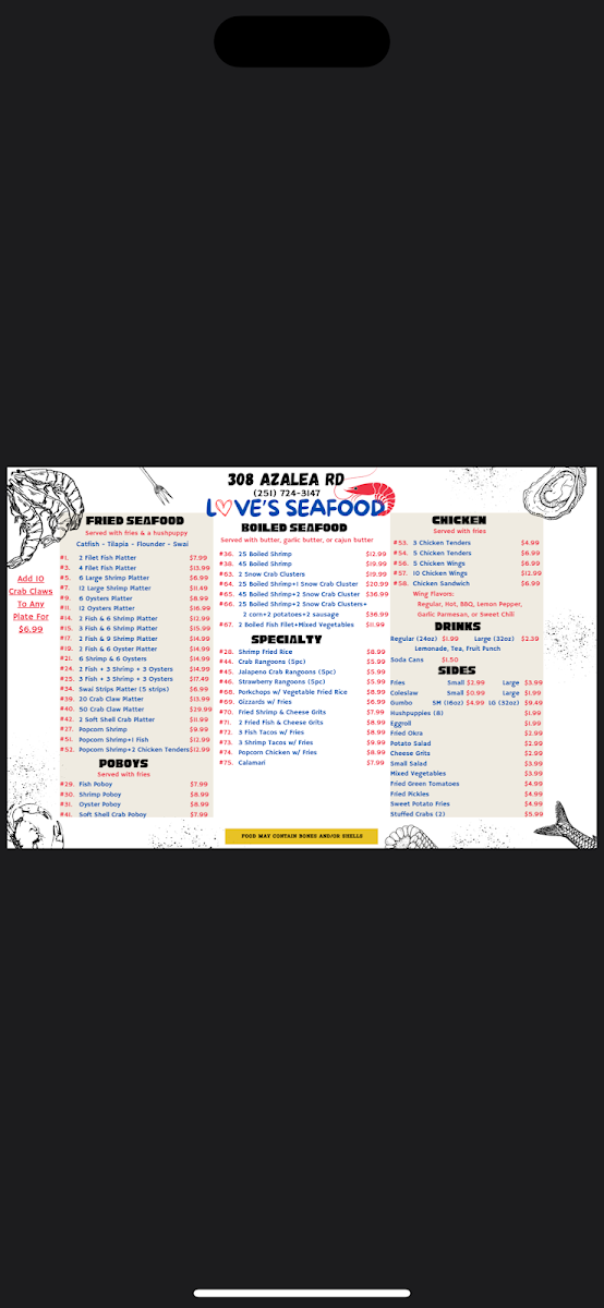 Love's Seafood on Azalea Rd offers a diverse menu that caters to a variety of seafood lovers. For fried seafood, options include the 2 Filet Fish Platter and the 4 Filet Fish Platter, as well as generous portions of shrimp with the 6 Large Shrimp Platter and 12 Large Shrimp Platter, and a 6 Oysters Platter for those craving oysters. The boiled seafood selection features 25 Boiled Shrimp or 45 Boiled Shrimp, along with 2 Snow Crab Clusters, or combinations like 25 Boiled Shrimp + 1 Snow Crab Cluster and 45 Boiled Shrimp + 2 Snow Crab Clusters. The chicken offerings are also a highlight, including 3 Chicken Tenders, 5 Chicken Tenders, 5 Chicken Wings, and 10 Chicken Wings, as well as a satisfying Chicken Sandwich. For something a bit different, the Shrimp Fried Rice, Crab Rangoons (5pc), and Jalapeno Crab Rangoons (5pc) are great choices, along with the sweet Strawberry Rangoons (5pc). The menu also features Porkchops with Vegetable Fried Rice, a hearty specialty. For those craving a sandwich, the Fish Poboy, Shrimp Poboy, Oyster Poboy, and Soft Shell Crab Poboy offer fresh, flavorful options. A variety of sides are available, including Fries, Coleslaw, and Lg Coleslaw, as well as comforting Gumbo (16oz and 32oz). To complement your meal, drinks come in regular 24oz or large 32oz sizes, along with Soda Cans. With such a wide array of seafood, chicken, and side dishes, Love's Seafood offers something for every taste, making it a go-to spot for both casual meals and special cravings.